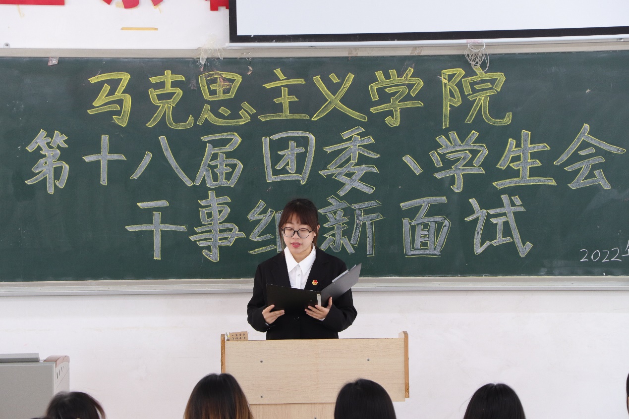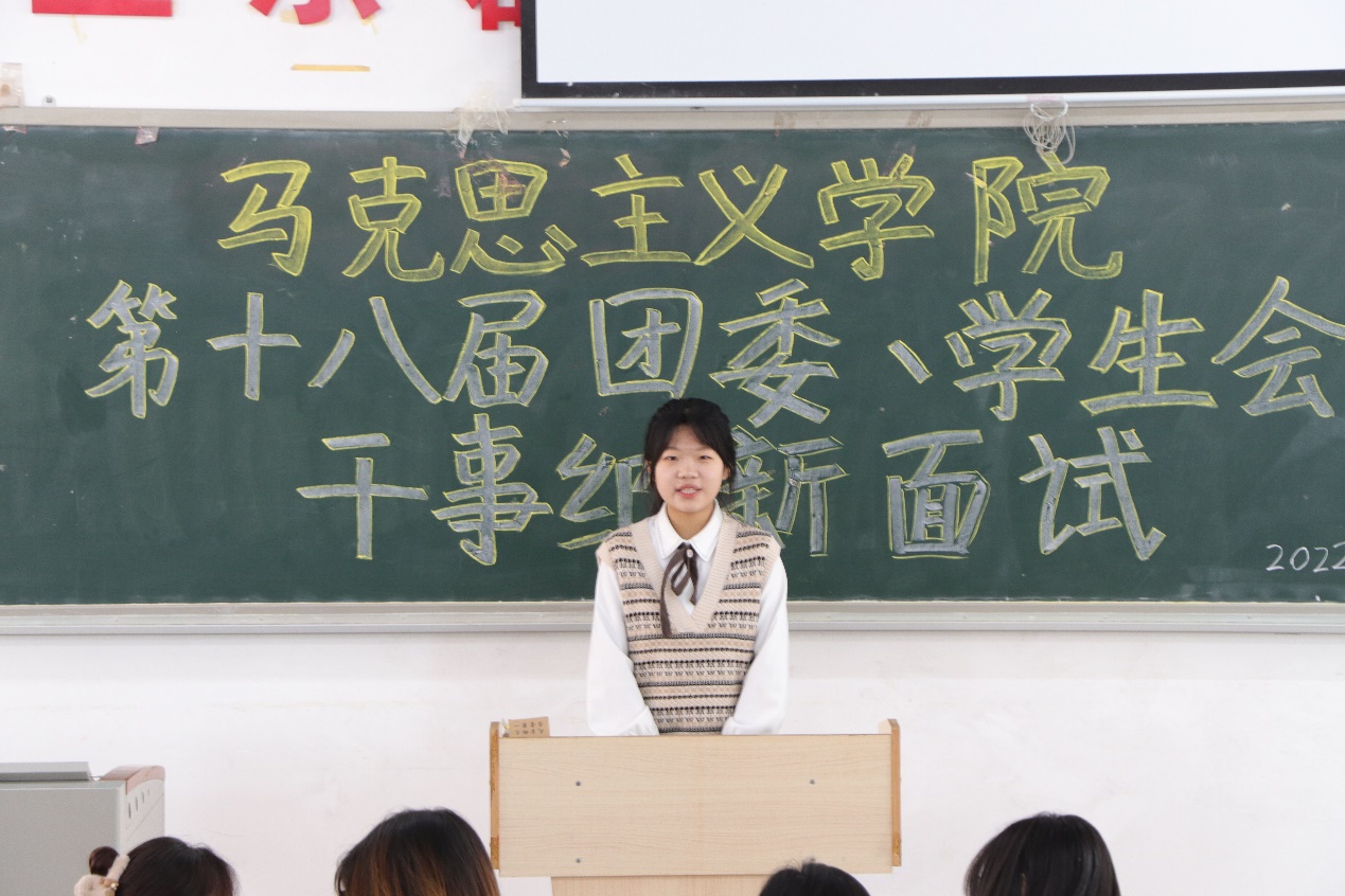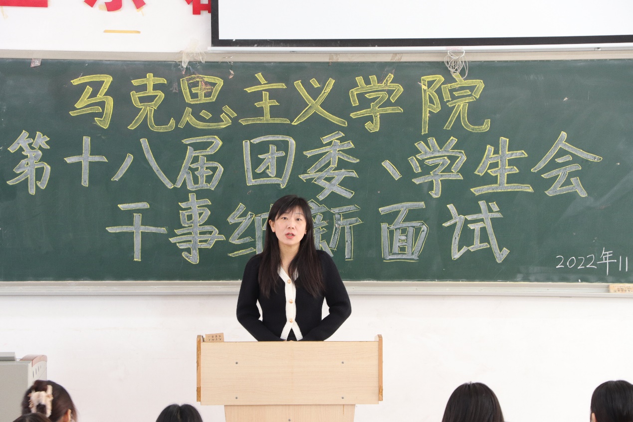 最后,由团委书记孙艺楠老师对本次纳新面试进行总结。她首先对竞选同学的良好表现给予了肯定,并勉励大家无论是否竞选成功,都要秉持思政学子应有的谦逊态度与进取精神,积极投身于学院组织的各项活动与工作当中,为学院的建设与发展做出贡献。同时她强调作为团委、员工会成员,要不断提高责任意识、服务意识,工作中务实高效,同时平衡好工作和学习的关系,做学习标杆,以高标准、严要求来约束自我,以实际行动践行“继承发展、求实创新”的院训。