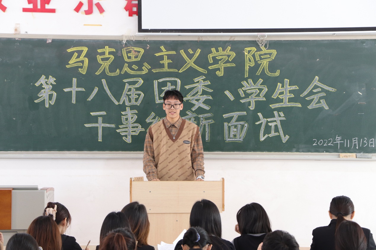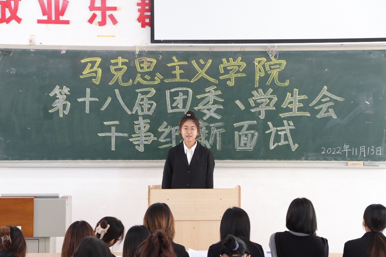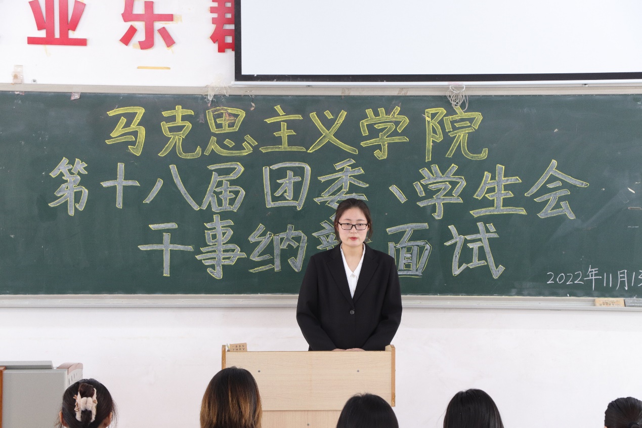 最后,由团委书记孙艺楠老师对本次纳新面试进行总结。她首先对竞选同学的良好表现给予了肯定,并勉励大家无论是否竞选成功,都要秉持思政学子应有的谦逊态度与进取精神,积极投身于学院组织的各项活动与工作当中,为学院的建设与发展做出贡献。同时她强调作为团委、员工会成员,要不断提高责任意识、服务意识,工作中务实高效,同时平衡好工作和学习的关系,做学习标杆,以高标准、严要求来约束自我,以实际行动践行“继承发展、求实创新”的院训。